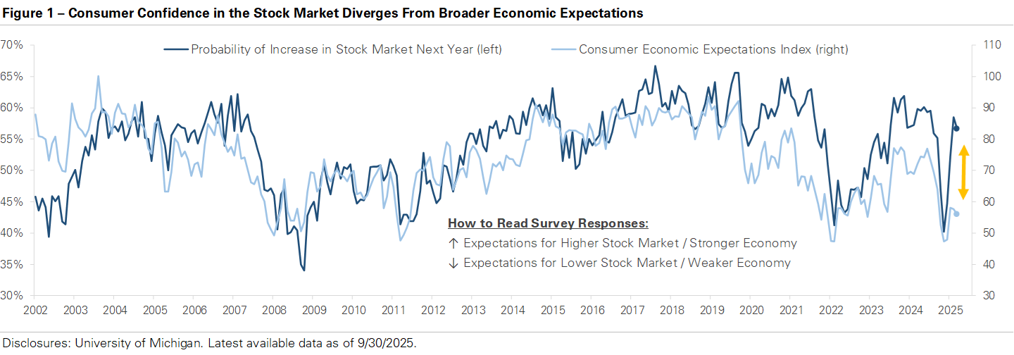 Consumers are increasingly optimistic about the stock market. The S&P 500 has setover 20 new all-time highs since the end of May, and investors expect more gains. Corporate earnings have proven resilient, and the artificialintelligence industry is driving both economic and earnings growth as hundredsof billions are invested in AI infrastructure. Trade policy uncertainty haseased from earlier this year, and the Federal Reserve’s September rate cutreinforced expectations for a “soft landing”, where the economy slows butavoids a recession. Many households have directly benefited from the market’sgains through investment and retirement accounts, boosting confidence despitemixed signals from the economy and labor market.