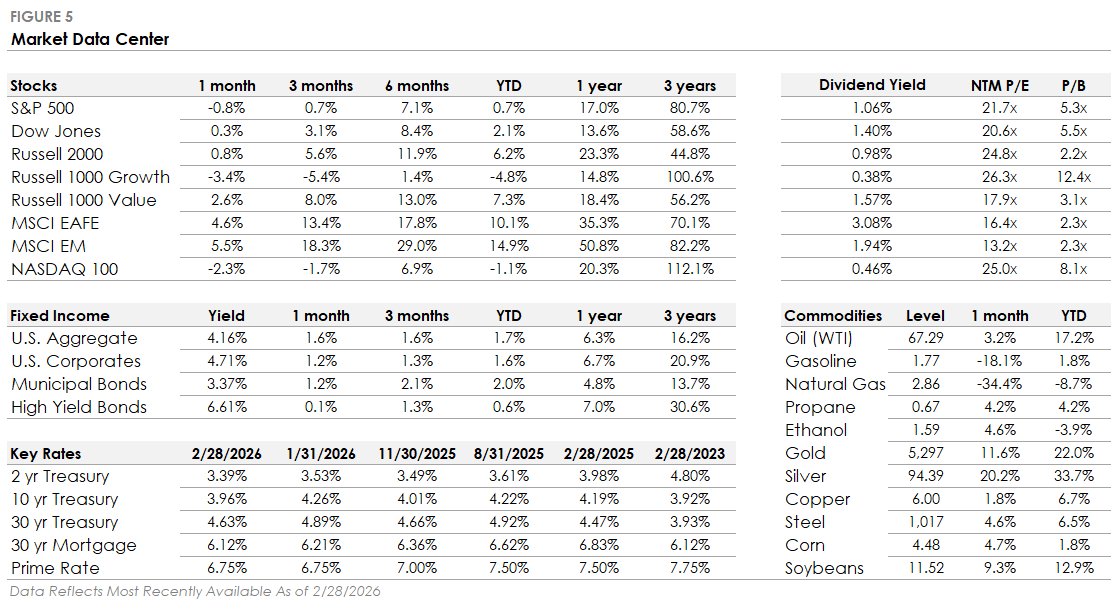 February was a busy month filled with AI headlines, shifting market leadership, and policy uncertainty. But beneath the surface, the economic backdrop remains stable, and the Federal Reserve remains patient. As leadership broadens beyond a narrow group of mega-cap stocks, diversified portfolios are beginning to benefit from a healthier market structure.