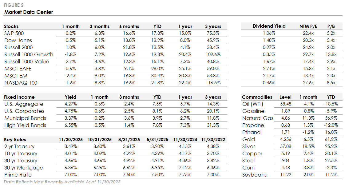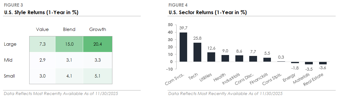 Artificial intelligence remains a key market driver with 7 of the 10 largest S&P 500 companies, or nearly 30% of the index, tied to the AI industry. In November, there was a noticeable shift in investor sentiment toward AI stocks, moving from broad enthusiasm to increased scrutiny and selectivity. The month began with concerns over the expensive valuations of the Magnificent 7 tech giants, particularly those most reliant on the AI infrastructure buildout. Questions emerged about whether the massive capital spending on data centers and cloud infrastructure will translate into profits strong enough to justify the companies’ high valuations. This skepticism around AI’s economics led to a sell-off across the AI industry, with companies like Nvidia and Amazon down over -10% at times. Given the S&P 500’s extreme concentration in mega-cap technology stocks, the focused weakness was a major factor dragging down the index.