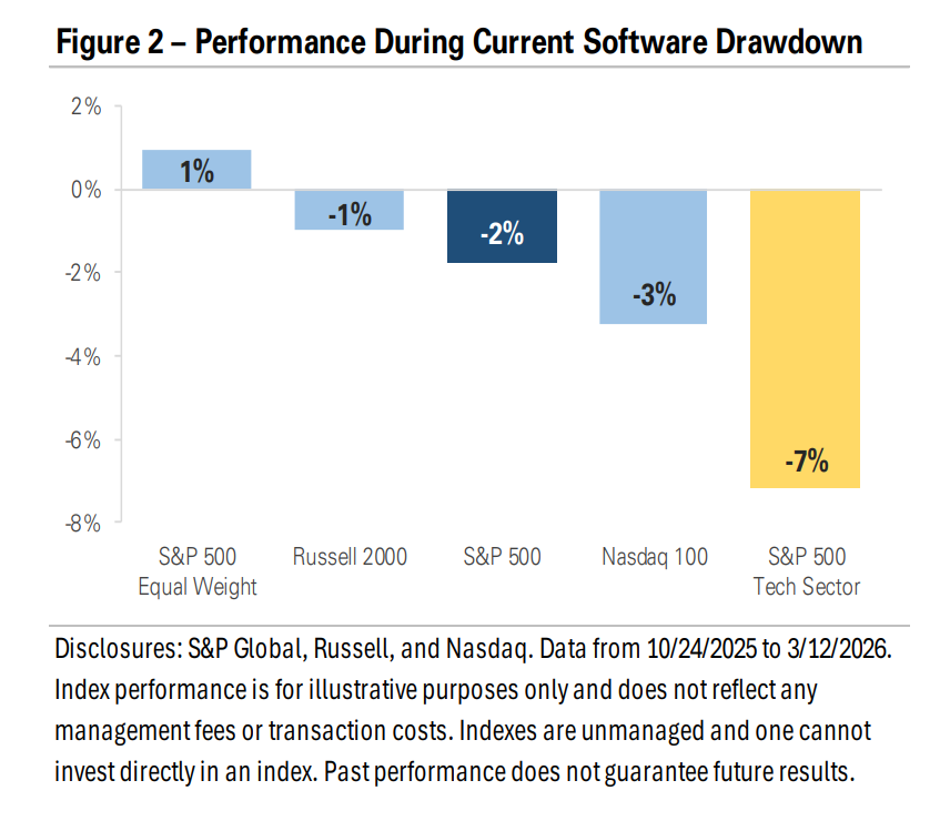The software industry has declined nearly -30% from its peak last October, one of the largest non-recessionary drawdowns in over 30 years. Figure 1 puts the decline in historical context alongside the other major software selloffs. The two largest drawdowns before the current one, the dot-com bust and the 2008 financial crisis, both occurred during recessions, when corporate earnings were declining and businesses were cutting spending. The 2022 selloff, driven by the Federal Reserve’s aggressive rate-hiking cycle, was the first major non-recessionary decline and saw software stocks fall nearly -40%. The current drawdown, at nearly -30%, surpasses the COVID pandemic, but it’s driven by a fundamentally different catalyst: artificial intelligence.