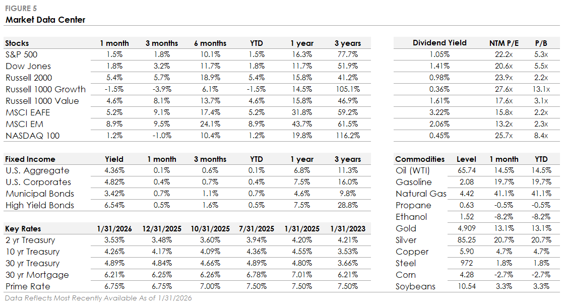 The second theme was a sharp rally in the commodity market. Despite late month volatility, gold rose +10% to a new high, silver surged over +20% to a new high, and oil prices rose to the highest level since last September. Investors turned to commodities as a hedge against global uncertainty, driven by geopolitical tensions, policy uncertainty, and a weaker U.S. dollar. The strength in commodity markets made Energy and Materials the top two performing sectors. This year’s start, with the stock market rotation and commodity rally, highlights how portfolio diversification can help smooth results when leadership shifts.